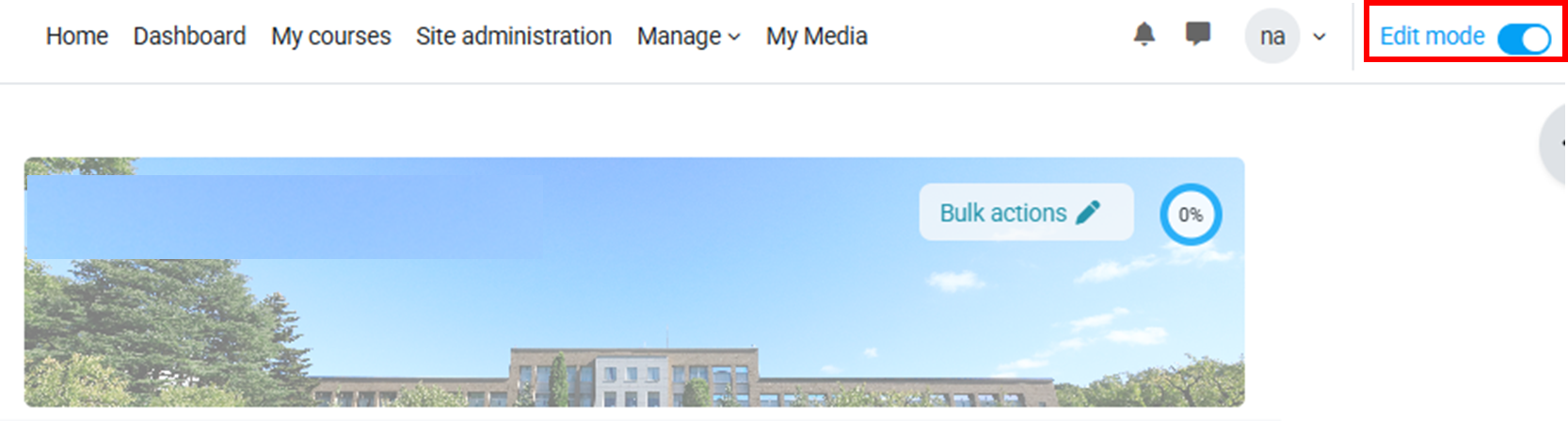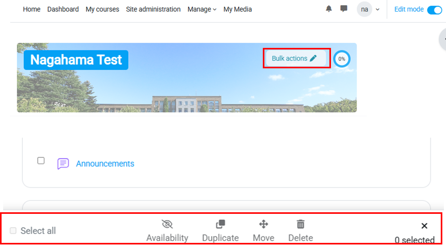 編集モードで右上の「Bulk actions(日本語:バルク編集)」を押し、下の「すべてを選択」にチェックを入れると、コースコンテンツを一括編集することができます (表示/非表示、複製、移動、削除)。