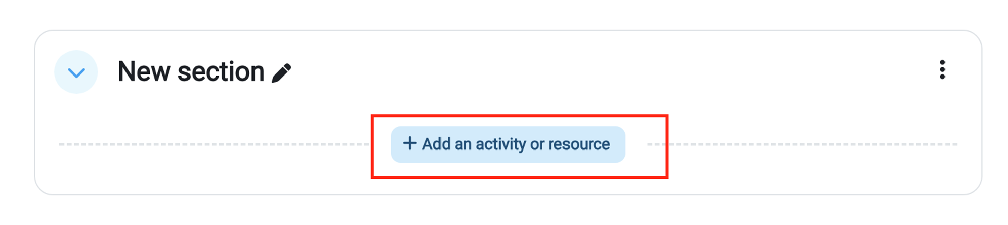 各セクションの下部にある「+Add an activity or resouce」をクリックして教材を追加してください。
