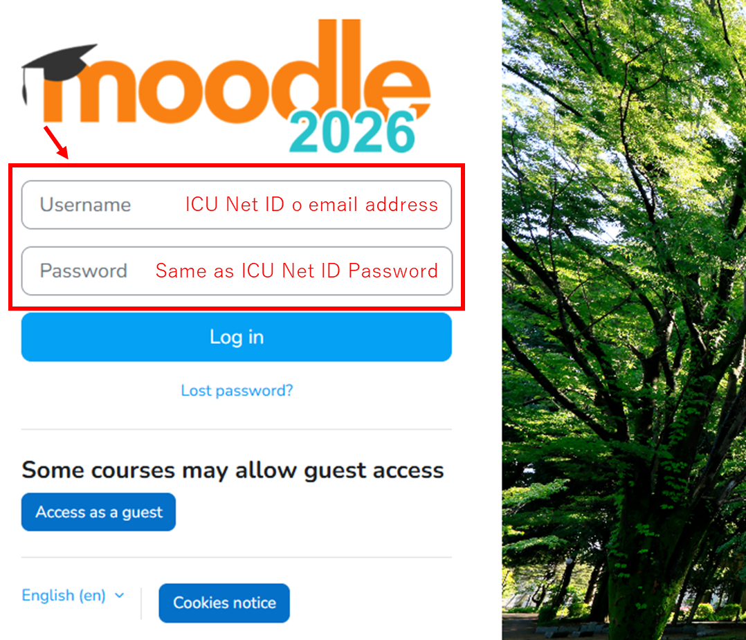 Moodle ログインには、ICU Net IDが必要です。ICU Net IDやパスワードを忘れた場合は、helpdeskにお問い合わせください。